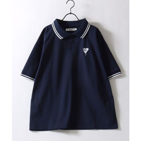 【SITRY Heart Embroidery Polo Shirt/別注 オーバーサイズ ハートロゴ ワンポイントラメ刺繍 リブライン 半袖ポロシャツ レディース メンズ】