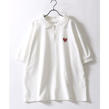 【SITRY Heart Embroidery Half Zip Polo Shirt/別注 オーバーサイズ ハートロゴ ワンポイントラメ刺繍 ハーフジップ 半袖ポロシャツ レディース メンズ】