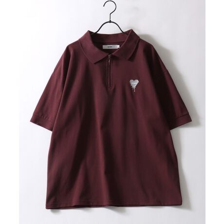 【SITRY Heart Embroidery Half Zip Polo Shirt/別注 オーバーサイズ ハートロゴ ワンポイントラメ刺繍 ハーフジップ 半袖ポロシャツ レディース メンズ】