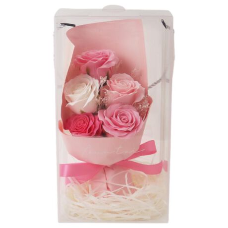 【いつまでも華やぐ花の贈り物】贈り物にぴったりなソープフラワーのミニブーケ。【水やり不要で美しさ長持ち】石鹸素材でつくられたソープフラワーだからお手入れいらずで美しい姿がずっと続く嬉しさ◎【持ち手付きでそのまま贈れる】持ち手付きのクリアパッケージ入りだからラッピング不要でそのまま手渡しできる。【バラとカスミソウの華やかさ】ソープフラワーのバラとブリザーブドのカスミソウが華やかさと上品さを兼ね備えた組み合わせ。【母の日や卒業式のギフトに】母の日やお誕生日のお祝いにはもちろん卒業式や記念日の贈り物としても喜ばれる定番ギフト♪【ほのかに香る石鹸素材の花】お部屋に飾ればほのかに石鹸のやさしい香りがただよいインテリアとしても楽しめる〇