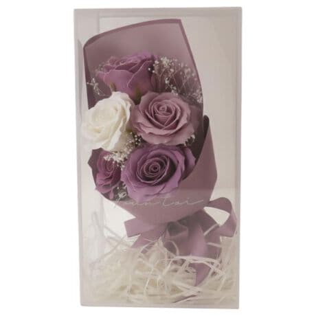 【いつまでも華やぐ花の贈り物】贈り物にぴったりなソープフラワーのミニブーケ。【水やり不要で美しさ長持ち】石鹸素材でつくられたソープフラワーだからお手入れいらずで美しい姿がずっと続く嬉しさ◎【持ち手付きでそのまま贈れる】持ち手付きのクリアパッケージ入りだからラッピング不要でそのまま手渡しできる。【バラとカスミソウの華やかさ】ソープフラワーのバラとブリザーブドのカスミソウが華やかさと上品さを兼ね備えた組み合わせ。【母の日や卒業式のギフトに】母の日やお誕生日のお祝いにはもちろん卒業式や記念日の贈り物としても喜ばれる定番ギフト♪【ほのかに香る石鹸素材の花】お部屋に飾ればほのかに石鹸のやさしい香りがただよいインテリアとしても楽しめる〇