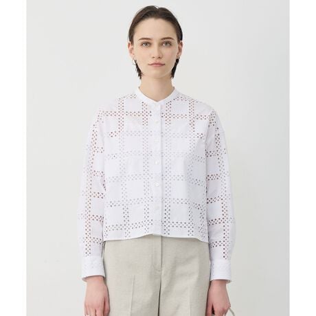 ■デザインアイレット刺繍が格子状にデザインされたバンドカラーのクロップド丈シャツです。衿とカフスには無地の別布を使用することで、甘くなり過ぎないよう拘りました。スタイリングに取り入れて頂くだけで、ぐっと春夏気分を盛り上げる1枚です。前を閉じての着用はもちろん、釦を開け羽織としても活躍します。パンツやスカートはもちろん、ワンピース合わせも出来る着回し力抜群のアイテムです。