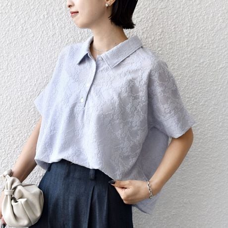 シアー感が可愛いジャカード素材のポロシャツです。