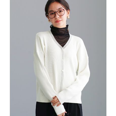 リブ編みニットを使用したVネックカーディガン。