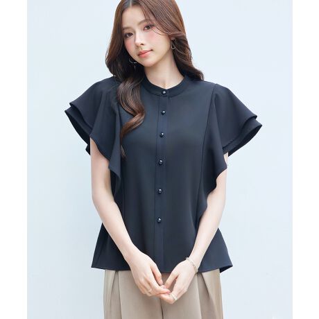 大きめ二段フリルがボリュームたっぷりのスタンドカラーブラウス。
