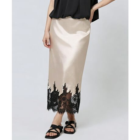 パーティー映えもする裾レースとサテン生地がドッキングしたロングスカート。