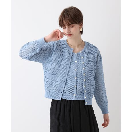 光沢のあるリリヤーンに透け素材の糸、ほのかに煌めくメタリックヤーンを組み合わせ、ハチの巣の様なメッシュ編みに仕上げた表情のある素材です。
