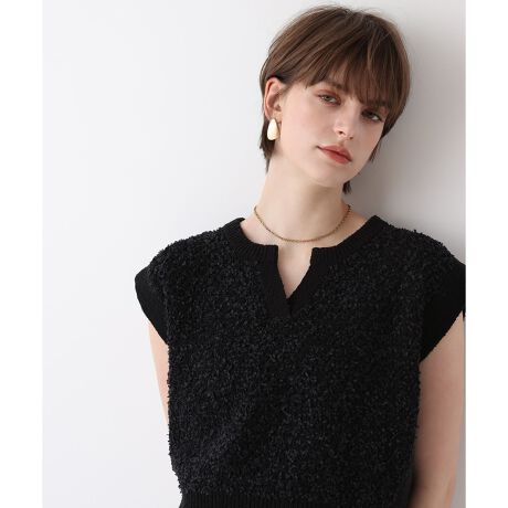 表情のある意匠糸をきゅっと編み込んだプルオーバー。Tシャツやタンクトップにレイヤードして着こなすのがおススメ。ゆるりと身体から離れるので、タックアウトしたままボトムに合わせて決まります。ストンと着るだけで、デイリーウェアを華やかに彩るアイテムです。