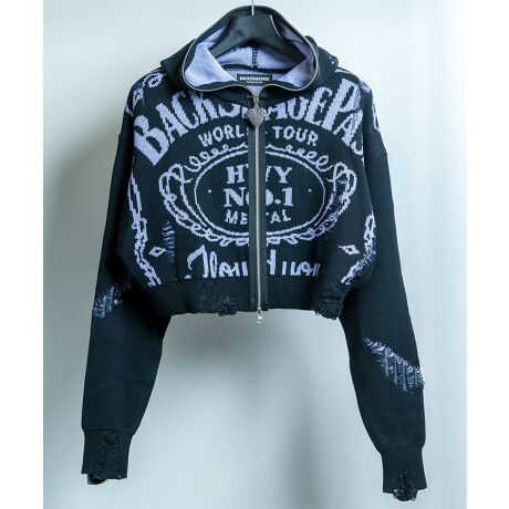 BACKSTAGE PASS(バックステージパス) のBONZO HOODIE-S-KNIT(ボンゾ フーディーエス-ニット)ロゴジャガード オーバーサイズ ダメージニット ショート丈パーカーです。
