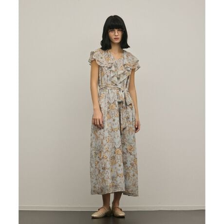 [型番:0126231103]華やかなサラサプリントのシフォン素材を使用したフリルカラーワンピース。※こちらのモデル着用画像はサンプル品を撮影しております。実際の商品と仕様、加工、サイズが若干異なる場合がございます。予めご了承くださいませ。