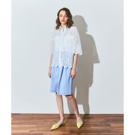[型番:0226241016]繊細な柄のコードレースを使用して、衿と前立て、袖口をタイプライター地で切り替えたハーフスリーブシャツ。同シリーズでおつくりしたレースイージパンツ【品番:0226211016】のご用意もございます。※こちらのモデル着用画像はサンプル品を撮影しております。実際の商品と仕様、加工、サイズが若干異なる場合がございます。予めご了承くださいませ。