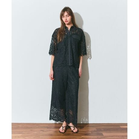 [型番:0226211016]繊細な柄のコードレースを使用してウエストベルトをタイプライター地で切り替えたライナー付きロングパンツ。同シリーズでおつくりしたレースコンビシャツ【品番:0226211016】のご用意もございます。※こちらのモデル着用画像はサンプル品を撮影しております。実際の商品と仕様、加工、サイズが若干異なる場合がございます。予めご了承くださいませ。