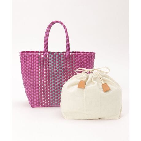 ビニールの平紐を編み込んだ、軽やかな表情のマルシェミニトートバッグ。