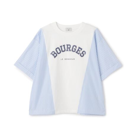 異素材切り替えが映えるカレッジロゴTシャツ。カジュアルなカレッジロゴに、異素材の切り替えで遊び心をプラスしたTシャツ。袖とサイドにはストライプ生地を使用し、ピッチを変えることでシンプルながらも印象的なデザインに仕上げました。裾にはドローストリングをほどこし、シルエットを自由に調整できるのもうれしいポイント。カラーはさわやかなブルー系のオフホワイトとシックな黒の2色展開。デニムやスカートとの相性も抜群で、コーディネートの主役になる一枚です。