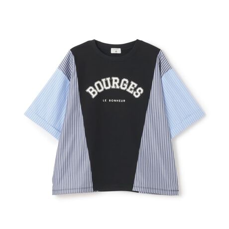 異素材切り替えが映えるカレッジロゴTシャツ。カジュアルなカレッジロゴに、異素材の切り替えで遊び心をプラスしたTシャツ。袖とサイドにはストライプ生地を使用し、ピッチを変えることでシンプルながらも印象的なデザインに仕上げました。裾にはドローストリングをほどこし、シルエットを自由に調整できるのもうれしいポイント。カラーはさわやかなブルー系のオフホワイトとシックな黒の2色展開。デニムやスカートとの相性も抜群で、コーディネートの主役になる一枚です。