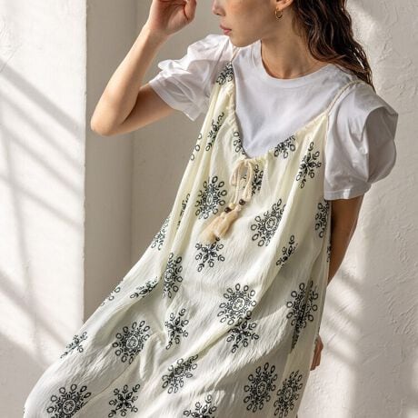 編み上げデザインの肩紐と、さりげなくあしらったウッドビーズがエスニックなアクセントに。