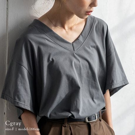 首元は抜け感のある深めのVネック仕様で、顔まわりをすっきりとした印象に。