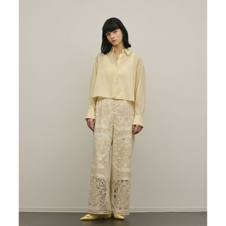 [型番:0326241308]軽くサラリとした風合いの麻調合繊素材を使用したシャツ。バックは多数に入れたタックにより裾にフレアを出したデザインとなっております。※こちらのモデル着用画像はサンプル品を撮影しております。実際の商品と仕様、加工、サイズが若干異なる場合がございます。予めご了承くださいませ。