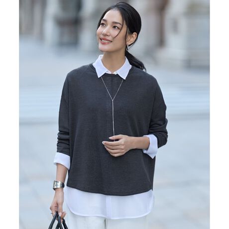 ■デザイン程よいゆとりのあるボディと細身の袖のメリハリのあるシルエットが特徴のニットです。適度なハリのある素材でボディーラインを拾いにくく、1枚でサマ見えします。袖はすっきりとしているので、アウターも羽織りやすく早い時期から活躍します。長袖ながら、サラッと爽やかタッチの素材で、気温が高い時期にも着用できるのも嬉しいポイント。カラーは華やかなフューシャ(014)ベーシックなチャコール(004)ニュアンスカラーのオリーブグレー(063)トープ(042)の4色展開です。