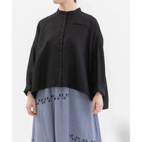 四角いシルエットがラフな印象のスタンドカラーシャツ。たっぷりとしたボリューム感がありながら、肩まわりはきれいに見えるすっきりとしたシルエットで人気の一枚です。両玉縁ポケットが凛とした印象を添えるアクセントディテール。前が短めデザインで、軽やかなバランスに仕上げました。袖はすっきりとした9分丈で、夏場の羽織りとしても活躍します。ボタン間隔に不規則なリズム感を持たせ、さりげないアクセントに。開けた時にちらりと見える配色ステッチもポイントです。
