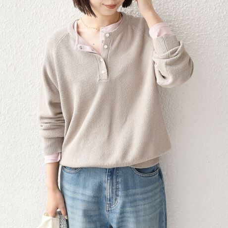ヘンリーネックを前にして抜け感を出したり、クルーネックを前にしてシンプルにまとめたりと、雰囲気を変えて楽しんでいただけます。