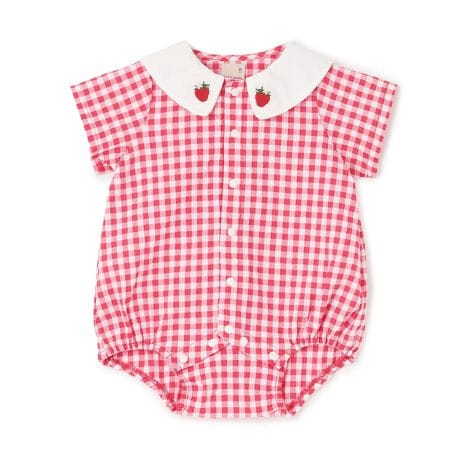 フルーツの刺しゅうをのせた衿元が可愛らしいロンパースです。モチーフをイメージさせる色のチェック柄で全体をまとめ、明るくポップな雰囲気に仕上げました。股部分とフロントにスナップボタンがついており、お着替えもおむつ替えもスムーズです。【おすすめの着用時期は春夏シーズン】