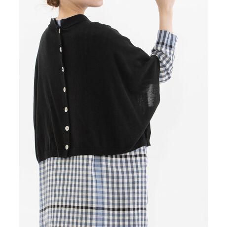 麻混の糸を使用した、シャリ感と清涼感のあるポンチョカーディガン。繊細なハイゲージ編みで、カジュアルにも取り入れやすい一枚です。肘にかかる6分袖と、抜け感のあるフォルムがポイント。前後どちらでも着られる2way仕様で、ベストとしても軽い羽織としても活躍します。上品なアコヤ貝釦を使用しています。