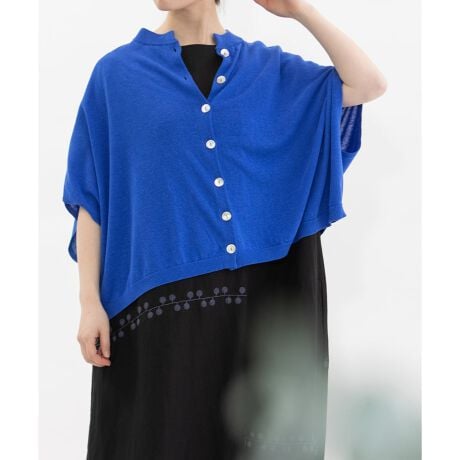 麻混の糸を使用した、シャリ感と清涼感のあるポンチョカーディガン。繊細なハイゲージ編みで、カジュアルにも取り入れやすい一枚です。肘にかかる6分袖と、抜け感のあるフォルムがポイント。前後どちらでも着られる2way仕様で、ベストとしても軽い羽織としても活躍します。上品なアコヤ貝釦を使用しています。