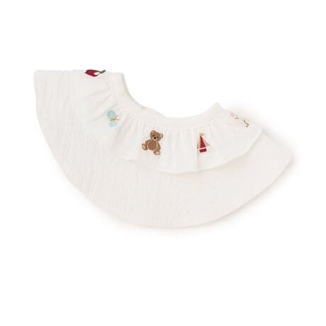 衿元のフリルと刺しゅうが可愛らしいスタイです。異なる風合いの生地を2段重ねにして、つけ衿のようなおしゃれなルックスに仕上げました。よだれをしっかりガードする防水仕様なのもポイント。首回りには簡単に着脱できるスナップボタンを採用しました。