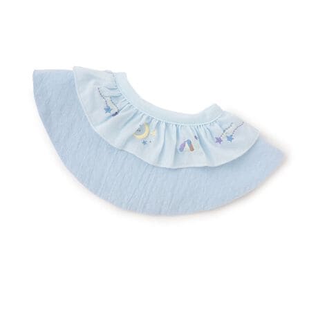 衿元のフリルと刺しゅうが可愛らしいスタイです。異なる風合いの生地を2段重ねにして、つけ衿のようなおしゃれなルックスに仕上げました。よだれをしっかりガードする防水仕様なのもポイント。首回りには簡単に着脱できるスナップボタンを採用しました。