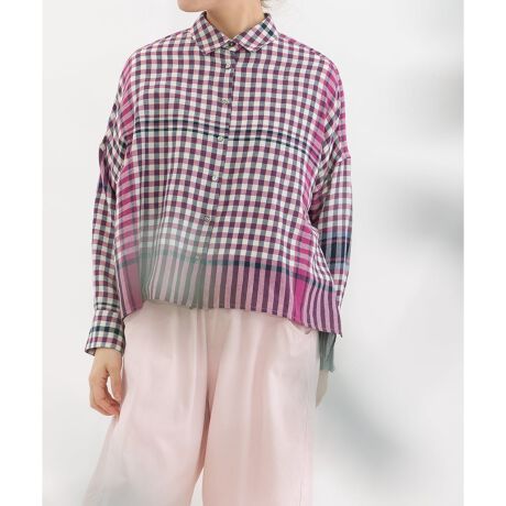 レトロな配色のギンガムチェックに、キッチンクロスのような裾柄を入れたオリジナルチェック生地で仕立てたシャツ。コットンリネンのやわらかなビエラ素材を使用し、軽やかで肌なじみの良い着心地に仕上げました。後ろボタンダウン仕様の、トラディショナルな衿がポイントのクロップド丈シャツ。前後差のあるデザインですっきりとしたバランスです。開けた時にちらりと見える配色ステッチもさりげないポイントです。