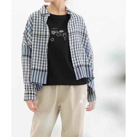 レトロな配色のギンガムチェックに、キッチンクロスのような裾柄を入れたオリジナルチェック生地で仕立てたシャツ。コットンリネンのやわらかなビエラ素材を使用し、軽やかで肌なじみの良い着心地に仕上げました。後ろボタンダウン仕様の、トラディショナルな衿がポイントのクロップド丈シャツ。前後差のあるデザインですっきりとしたバランスです。開けた時にちらりと見える配色ステッチもさりげないポイントです。