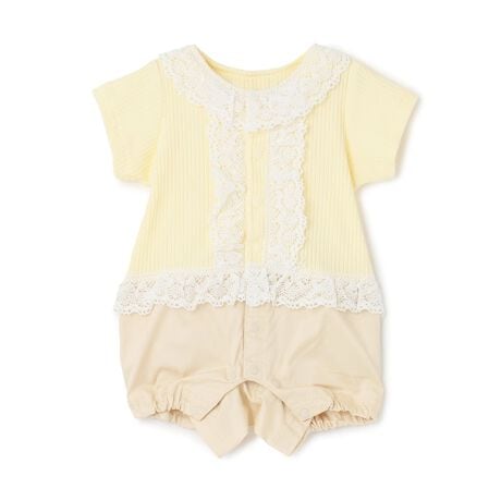 大胆なレースの切り替えで上品さを高めたカバーオールです。上下を異素材にしてコーディネート風にデザインしました。フロントと股部分にスナップボタンがついており、おむつ替えもお着替えもスムーズに行えるのがうれしいポイント。内側にお名前を記入できるタグがついています。【おすすめの着用時期は春夏シーズン】