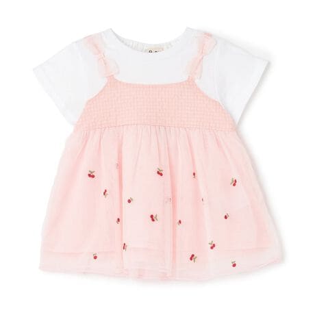 一枚でトップスが決まるレイヤード風のチュニックです。チュールに添えたチェリーの刺しゅうや肩リボン、Aラインのシルエットが可愛らしいポイント。さらりとした肌触りの裏地つきなので、透けてしまう心配がありません。スカートで甘めにしても、パンツでカジュアルに着こなしてもおしゃれです。