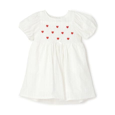 胸元のハート刺しゅうが映えるワンピースです。ボリューミーな袖と、ギャザーによるフレアなシルエットが可愛らしいポイント。前ヨークのシャーリング仕様でやさしいフィット感を実現します。裏地があり、透けにくいのもうれしいところです。両側にポケットを備えています。【おすすめの着用時期は春夏シーズン】