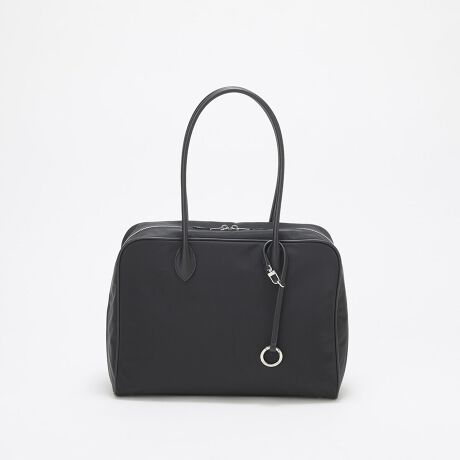 肩に心地よく収まる細身のレザーハンドルに、底まで大きく開くダブルファスナーで荷物の出し入れもスムーズ。