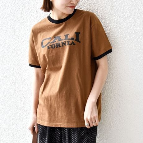 ヴィンテージ感のあるプリントと、バイカラーのリンガーデザインがスタイリングのアクセントに。