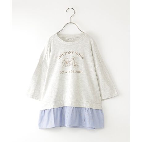 [型番:13231823]布帛ブラウスにトレーナーを重ねたような、ドッキングデザインの7分袖Tトレ。裾からのぞくフリルがやわらかな表情を添え、カジュアルな中に軽やかさをプラスします。【素材】中肉厚のカットソー。【デザイン】トレーナー×布帛ブラウスの重ね着風。【ikkaポイント】肌寒い時期でも着用しやすいように中肉素材を採用。トレーナー風デザインのTシャツです。花×ロゴプリントも可愛いポイント。