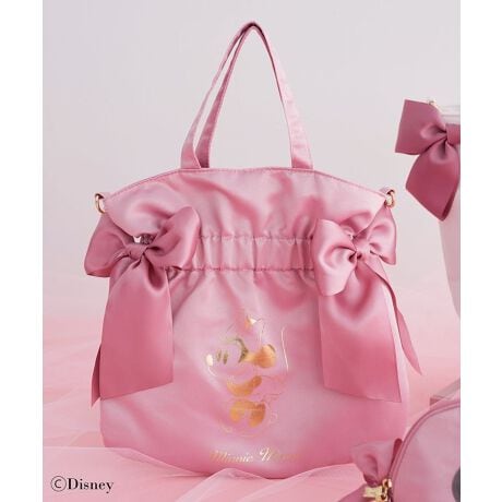 ピンクのサテン生地にゴールドの箔プリントで「ミニー」を表現した2WAYトートバッグ。