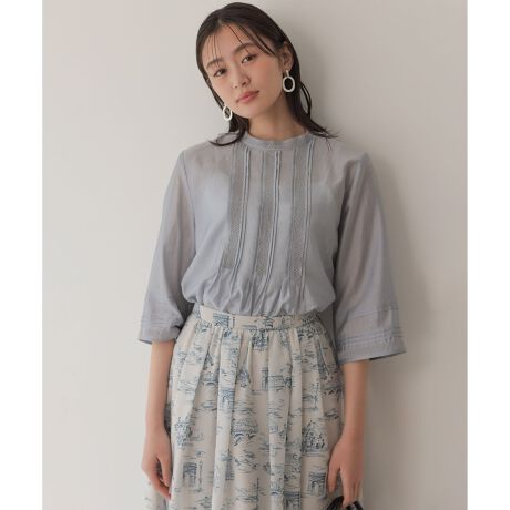 ■デザイン・ピンタックとテープレースの組み合わせがまるでアンティークの様な繊細な雰囲気が魅力のブラウス。・テープレース3種類の組み合わせを使用。ピンタックに沿わさせスタンド襟、胸元、袖フレア切り替え、後ヨークにまで贅沢にあしらっています。・身頃からの途中消しのピンタックは気になる部分を程よくカバーしてパンツスタイルにもおすすめ。・スカートインにもスッキリ着用できます。・7分袖のフレア袖はピンタックで張らせて、華やかで腕を華奢に見せてくれます。・また7分袖なので着用期間も長くお楽しみいただけます。・同素材のスカートとセットアップでワンピース風に着ていただけます。