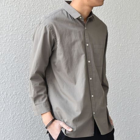 小ぶりなレギュラーカラーと、袖口はカフス仕様のキレイめな7分袖シャツ。