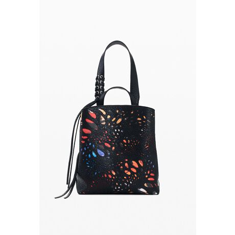 多色の型押しプリントを前面にあしらったミニサイズのフェイクレザーバックパック。短いハンドルと長さ調節可能なショルダーストラップ、上部ファスナー開閉。