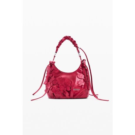 ソフトなレザーライク素材のボディ全体に立体的なフラワーアップリケを贅沢にあしらった、存在感際立つミニショルダーバッグ。ギャザー入りのショートハンドルと、ショルダーストラップ付き。