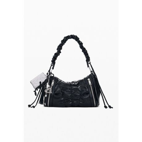 クラッシュ加工を施したレザーライク素材の立体的なギャザーボディが印象的なミディアムショルダーバッグ。シルバーのスター&チャーム付き。
