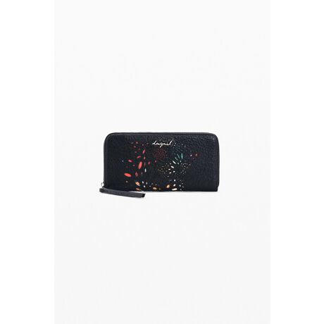 コントラストカラーの蝶の型押しプリントが施されたレザー調エフェクトの財布。ファスナー開閉の細長いデザイン。