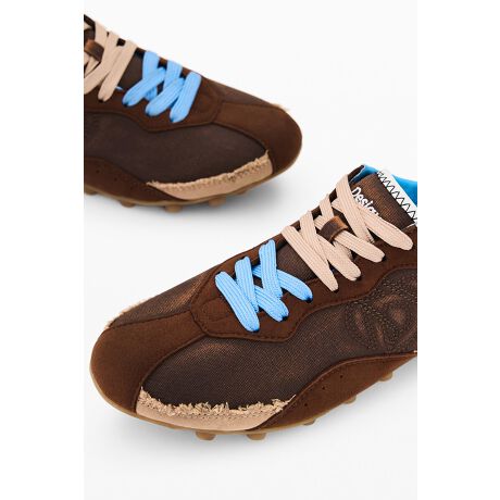 ブラウンのテキスタイル素材を使用したローカットスニーカーで、合成皮革のディテールとコントラストのあるギザギザソールが特徴です。シューレース仕様のデザインで、サイドとかかと部分に異素材のコンビネーションをあしらっています。