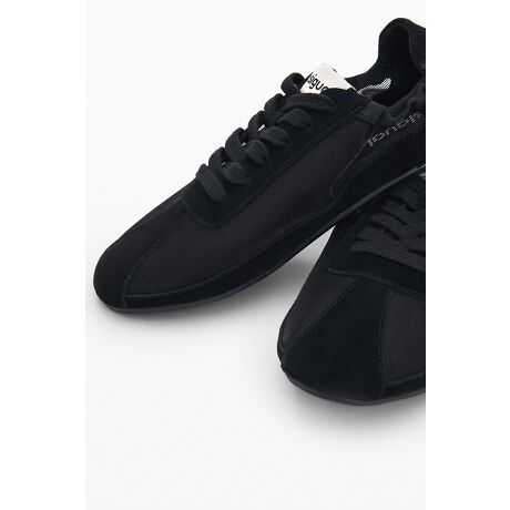 黒のスエードとメッシュを組み合わせたアッパーのローカットレザースニーカー。フロントのレースアップデザインで、薄型ソール。