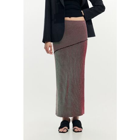 チューブデザインとゴムウエストのニットスカート。コントラストの効いた縦ストライプ柄の生地で、上部はアシンメトリーな仕上がり。