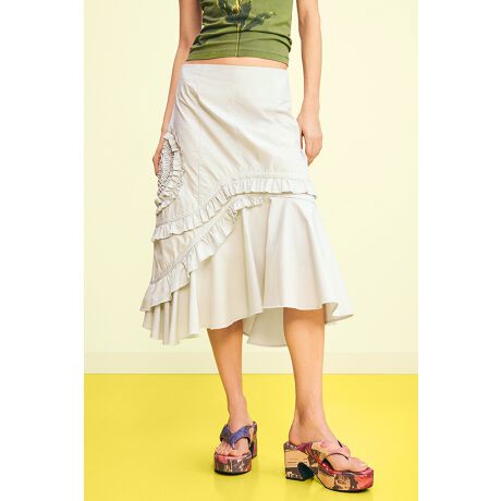 100%コットンの織り生地を使用したアシンメトリースカートで。 不規則な裾のフリルが動くたびに揺れてエレガントな表情を生み出す、大人ロマンティックな1着です。