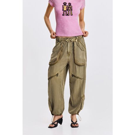 ベージュカラーの生地で作られたカーゴパンツ、広いポケット付き、クロップド丈。目に見える縫い目のディテールと、裾のドローコードで調整可能。